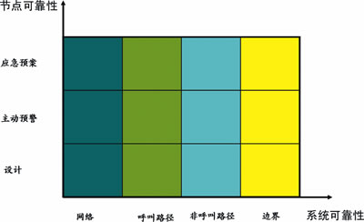 呼叫中心可靠性模型的每個(gè)維度都有一些設(shè)備/軟件節(jié)點(diǎn)組成,每個(gè)維度的可靠性需要通過組成節(jié)點(diǎn)以及節(jié)點(diǎn)之間鏈路的可靠性來實(shí)現(xiàn),節(jié)點(diǎn)可靠性的實(shí)現(xiàn)可以抽象為3個(gè)層次:設(shè)計(jì)可靠性、主動(dòng)預(yù)警能力和應(yīng)急預(yù)案。通過對所有節(jié)點(diǎn)3個(gè)層次的可靠性分析,可以實(shí)現(xiàn)可靠性模型每個(gè)維度的可靠性,從而實(shí)現(xiàn)系統(tǒng)可靠性。根據(jù)圖2的可靠性分析矩陣,可以建立呼叫中心可靠性分析方法。