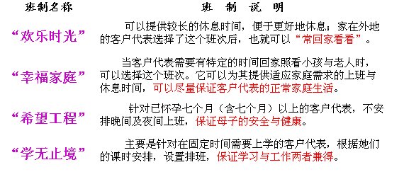 通過流程優(yōu)化,可以大大提高組織的運營效率和工作質(zhì)量,如:我們通過對員工排班流程的優(yōu)化,大大提高了客戶服務(wù)中心人員的利用效率、服務(wù)質(zhì)量,同時,還提高了員工滿意度。我們通過對流程中第3、4、5步工作方法的改進,大大提高了人員利用率,且提高幅度達20%以上。同樣,通過對第6步班次設(shè)置的改進,實施了個性化的班次設(shè)置(見表2),如:針對喜歡有整天休息時間,及家在外地的客戶代表,設(shè)置了“歡樂時光”輪班,為大家提供較長的休息時間,如兩天以上的連休,便于回家與更好地休息;針對家里有小孩子或老人、需在固定時間回家的客戶代表,設(shè)置了“幸福家庭”輪班,為他們提供適應(yīng)家庭需求的上班與休息時間,盡量保證員工的正常家庭生活;針對已懷孕及哺乳期的客戶代表,設(shè)置了“希望工程”輪班,不安排晚間及夜間上班,保證了母子的安全與健康;針對在固定時間需要上學的客戶代表,設(shè)置了“學無止境”輪班,主要是根據(jù)她們的課時安排設(shè)置排班,保證學習與工作兩者兼得。這種做法大大加強了員工積極性,并提高了員工的滿意度。