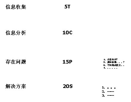 Tables)以及相應(yīng)的收集方法和時間;第二步是信息分析,明確了如何將已收集的5T(5 Tables)轉(zhuǎn)換成10張圖(10 Charts)以便進一步分析;第三步是發(fā)現(xiàn)存在問題,明確了如何從10C(10