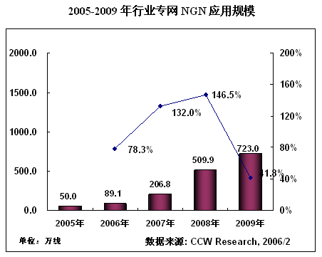 在運營商NGN建設高速增長的同時,政府、能源、交通等行業(yè)專網(wǎng)NGN建設也逐漸步入快車道。NGN在行業(yè)專網(wǎng)的應用,到2005年底的應用規(guī)模達到50萬線,根據(jù)計世資訊(CCW Research)《2005-2006中國NGN產業(yè)應用趨勢研究報告》的預測,未來4年,NGN在行業(yè)專網(wǎng)市場將以95%的復合增長率高速增長。