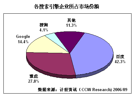 互聯(lián)網(wǎng)上的信息浩如煙海,是典型的信息爆炸,因此絕大多數(shù)網(wǎng)民都必須依靠搜索引擎才能找到所需信息,這個(gè)龐大的需求也就注定了搜索引擎市場(chǎng)的興旺繁榮。計(jì)世資訊(CCW Research)數(shù)據(jù)顯示:2004年中國(guó)的搜索引擎市場(chǎng)銷售總額達(dá)到9.4億元人民幣,增長(zhǎng)67.9%,2005年繼續(xù)保持47.9%的增長(zhǎng)速度,達(dá)到13.9億元,到2006年預(yù)計(jì)這個(gè)數(shù)字將突破20億元大關(guān)。