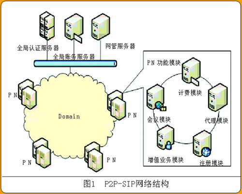 PN在地理上散布各處,邏輯上根據(jù)選用的P2P機(jī)制的不同可以是環(huán)形的(Chord協(xié)議)、矩陣的(CAN協(xié)議)、網(wǎng)狀的(Pastry協(xié)議和Tapestry協(xié)議);镜腜N至少包括注冊和代理兩種功能。為進(jìn)行商業(yè)運(yùn)營,可以部署全局認(rèn)證服務(wù)器、全局賬務(wù)服務(wù)器和網(wǎng)管服務(wù)器等等,用于管理全部的用戶和所有的PN。
