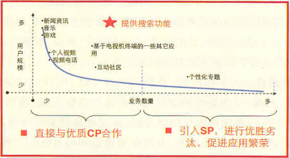 增值業(yè)務(wù)內(nèi)容定位可參考長(zhǎng)尾理論模型。長(zhǎng)尾理論的頭部通常是大眾市場(chǎng),要求產(chǎn)品滿(mǎn)足用戶(hù)符號(hào)化的需求,主流業(yè)務(wù)將具備更廣的流行效應(yīng),如新聞、游戲和音樂(lè),頭部的業(yè)務(wù)往往能夠滿(mǎn)足大規(guī)模用戶(hù)需求,提供優(yōu)質(zhì)業(yè)務(wù)體驗(yàn);尾部通常是細(xì)分市場(chǎng)和互動(dòng)市場(chǎng),要求業(yè)務(wù)滿(mǎn)足生產(chǎn)與消費(fèi)一體化的需求,體現(xiàn)交互性,為用戶(hù)帶來(lái)整合的、一對(duì)一的體驗(yàn),以促進(jìn)IPTV應(yīng)用繁榮。