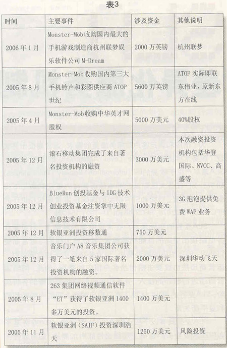 近幾年來,一些資本投資商將投資的重點放到了無線音樂、手機游戲和手機視訊等業(yè)務(wù)領(lǐng)域,逐步加大了對SP的投資力度(見表3)。進入2005年以來,著眼于2.5G向3G的全面演進,風(fēng)險投資對SP的投資力度進一步加大。以滾石移動為例,在2002年和2004年獲得兩輪風(fēng)險投資之后,滾石移動憑借在無線音樂領(lǐng)域取得的良好市場業(yè)績,又獲得了智基創(chuàng)投、華登國際、聯(lián)想投資等公司的投資,投資金額達(dá)3000萬美元。繼2004年10月獲得IDG投資以后,2005年12月7日,國內(nèi)著名的數(shù)字音樂門戶——A8音樂集團獲得了包括IDG和Intel投資公司在內(nèi)的5家國際著名投資機構(gòu)的投資,投資金額達(dá)2000萬美元。同月,掌中無限則獲得了來自全球性風(fēng)險投資商BlueRun創(chuàng)投基金和IDG總額達(dá)上千萬美元的投資。