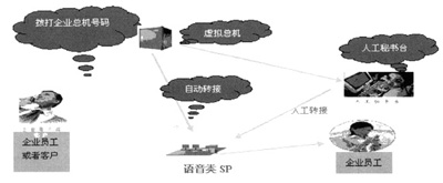 步驟五:如果用戶不知道員工分機號碼或者希望了解其他信息,主叫用戶可以選擇接入人工秘書臺。此時人工秘書臺會依據(jù)被叫號碼檢索出被呼叫集團的信息,同時根據(jù)主叫號碼檢索出主叫用戶是否為企業(yè)內(nèi)部員工或者企業(yè)客戶,同時將這些信息同步更新到人工秘書臺上,話務員根據(jù)這些信息可以完成作為企業(yè)特色話務員的服務工作;