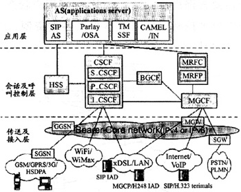 一般IMS分為三層,應(yīng)用層支持各類應(yīng)用服務(wù)器,負(fù)責(zé)為用戶提供增值業(yè)務(wù)和第三方業(yè)務(wù)。會(huì)話及呼叫控制層負(fù)責(zé)管理呼叫或會(huì)話設(shè)置,其中呼叫會(huì)話控制模塊CSCF完成呼叫網(wǎng)關(guān)功能、呼叫業(yè)務(wù)觸發(fā)功能和路由選擇功能,將SIP信令消息正確地轉(zhuǎn)發(fā)到應(yīng)用服務(wù)器。歸屬用戶服務(wù)器HSS用于維護(hù)每個(gè)終端用戶獨(dú)有的業(yè)務(wù)屬性,包括IP地址、漫游信息、好友列表、呼叫業(yè)務(wù)定制信息及語(yǔ)音郵件設(shè)置等。HSS是全網(wǎng)可用資源。媒體資源功能MRF包括MRFP和MRFC,負(fù)責(zé)提供及控制媒體流資源,如播放通知音、媒體流的混合、編解碼等。媒體網(wǎng)關(guān)控制MGCF負(fù)責(zé)PSTN承載與IP流之間的連接,根據(jù)被叫號(hào)碼和來(lái)話情況選擇CSCF,并完成PSTN與IMS之間的呼叫控制協(xié)議轉(zhuǎn)換,如將從CSCF接收到的SIP消息轉(zhuǎn)換為MEGACO或ISUP消息,并通過(guò)IP發(fā)送到信令網(wǎng)關(guān)SGW。出口網(wǎng)關(guān)控制功能BGCF主要實(shí)現(xiàn)呼叫路由功能,為呼叫選擇適當(dāng)?shù)腜STN接口點(diǎn),若發(fā)現(xiàn)該接口點(diǎn)與自己在同一網(wǎng)絡(luò),則選擇本網(wǎng)絡(luò)的MGCF與PSTN交互,若發(fā)現(xiàn)接口點(diǎn)在另一網(wǎng)絡(luò)時(shí),BGCF將會(huì)話信令轉(zhuǎn)發(fā)給另一網(wǎng)絡(luò)相應(yīng)的BGCF。一個(gè)IMS可以包含一個(gè)或多個(gè)CSCF、HSS、MGCF等功能模塊。傳送及接入層承載各種類型之間的轉(zhuǎn)換,完成與傳統(tǒng)PSTN/PLMN間的互通等功能,包括各類有線接入、無(wú)線接入、互聯(lián)互通網(wǎng)關(guān)等設(shè)備。