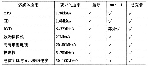 2.0接口相當(dāng),遠遠高于無線局域網(wǎng)802.11b的11 Mbit/s,也比下一代無線局域網(wǎng)802.11a/g的54 Mbit/s高出近一個數(shù)量級。UWB通信的功耗較低,能更好地滿足使用電池的移動設(shè)備的要求。另外,UWB信號的功率譜密度非常低,信號難以被檢測到,再加上采用的跳頻、直接序列擴頻等擴頻多址技術(shù),使非授權(quán)者很難截獲傳輸?shù)男畔,因而安全性非常好。?是一些典型的實時多媒體應(yīng)用對不同無線傳輸技術(shù)的數(shù)據(jù)傳輸速率的要求。從表中可以看出,如果采用無線的方式來進行傳輸,只有UWB技術(shù)可以滿足各種應(yīng)用的要求。