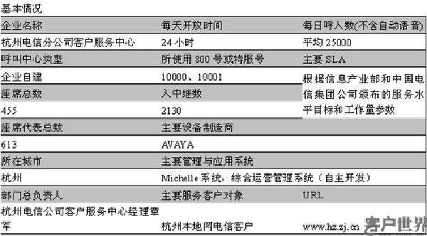 浙江省電信有限公司杭州市分公司客戶服務(wù)中心(以下簡稱杭州電信客服中心,或者杭州電信10000號)成立于2002年9月,是一個基于CTI技術(shù)、充分利用通信網(wǎng)和計算機網(wǎng)絡(luò)的綜合信息服務(wù)系統(tǒng),以電話為主,輔之以傳真、短信、Email、互聯(lián)網(wǎng)等多種接觸媒體,通過人工、自助語音與網(wǎng)上服務(wù)的方式,為杭州400萬電信客戶提供綜合電信業(yè)務(wù)的咨詢、查詢、受理、投訴、報障和電話營銷。建有2130路中繼通道,1410路自動語音通道,186個人工服務(wù)座席、189個電話營銷座席、80個外包座席,占地5600多平米,分別位于杭州市惠興路9號和慶春路133號。