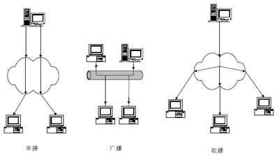 目前此類(lèi)業(yè)務(wù)在IP網(wǎng)上幾乎都是采用IP組播的方式來(lái)實(shí)現(xiàn)的。IP網(wǎng)通信包括三種通信方式(如圖1所示):?jiǎn)尾ィ║nicast)、廣播(Broadcast)和組播(Multicast)。單播是指源主機(jī)向指定單個(gè)目標(biāo)主機(jī)發(fā)送數(shù)據(jù)信息,單播連接是一一對(duì)應(yīng)的,即一個(gè)發(fā)送者只能對(duì)應(yīng)一個(gè)接收者;廣播指源主機(jī)向一個(gè)網(wǎng)絡(luò)段中的所有主機(jī)發(fā)送數(shù)據(jù)信息,即該網(wǎng)段所有主機(jī)都可以接收這個(gè)數(shù)據(jù)信息;組播介于單播、廣播之間,源主機(jī)向網(wǎng)絡(luò)中特定的一組主機(jī)發(fā)送數(shù)據(jù)信息,這些主機(jī)是靠組播地址來(lái)指定的。