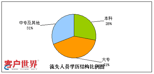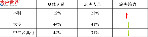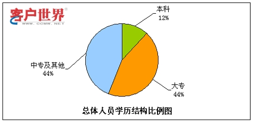 在接下來的魚骨圖分析中也確認了筆者的猜想,人員流失率過高就是影響服務質量的一個最主要的因素,為了解決這個問題,我們必須先要搞清楚人員高流失的原因是什么才能采取相應解決措施。人員流失涉及的原因很復雜,包括招聘、培訓、管理氛圍等多方面因素。而招聘正處于這個管理鏈條上的第一個環(huán)節(jié),從人力資源管理的角度出發(fā),招聘一個合適的人遠比招聘一個最優(yōu)秀的更為重要,因此筆者首先從招聘這個環(huán)節(jié)對人員流失的情況進行分析,在這個過程中筆者重點研究了在職人員結構及流失人員結構: