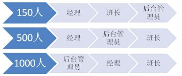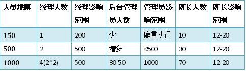 當員工人數(shù)在150人的時候,班長往往有10位左右。經理能有足夠的精力來兼顧全局,甚至和大部分員工認識,親自制定關鍵流程和制度,參與每次的重要信息傳達。那么這個時候,經理無疑是最為重要的管理者。班長是第二重要的,后臺管理員(質檢、維護、投訴處理、綜合行政等)就更多是個執(zhí)行角色。