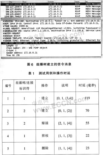 1出發(fā)的組播樹和單播連接,結(jié)果如表1所列。圖6顯示了Ethereal捕獲的組播樹建立的信令消息。在解開的Path消息中,可以發(fā)現(xiàn)經(jīng)過擴(kuò)展的UNI組播對象。然后,對已存在的連接進(jìn)行了動態(tài)的修改。在第三個測例中,一個葉子被添加到單播連接上并使其變?yōu)橐豢媒M播樹。在嫁接和剪枝的操作中,業(yè)務(wù)生成器在已建立的連接上沒有觀察到丟包的現(xiàn)象。