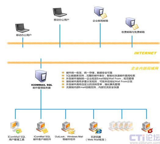 IComMail SQL企業(yè)郵件管理系統(tǒng)是埃康軟件推出的優(yōu)秀的郵件管理軟件,自2003年首推自今已有5年的發(fā)展歷史,系統(tǒng)設計先進、功能獨特完整、運行穩(wěn)定可靠,在國內(nèi)已有大批裝機用戶,其中以外貿(mào)、進出口等外向型企業(yè)為主要用戶群,廣大用戶已經(jīng)獲得了極大的受益。IComMail SQL系統(tǒng)主推的是其強大的郵件管理功能,與通常的郵件服務器Mail Server系統(tǒng)有著根本的區(qū)別,也有別于日趨流行的企業(yè)郵局服務,IComMail SQL系統(tǒng)是建立在通常的郵件服務器Mail Server或企業(yè)郵局的應用基礎上的,在企業(yè)局域網(wǎng)內(nèi)設立一IComMail郵件管理服務器,并采用穩(wěn)定可靠的SQL數(shù)據(jù)庫系統(tǒng)作為支撐,為企業(yè)建立安全可靠的企業(yè)郵件數(shù)據(jù)中心,并在此基礎上,擴展了很多高級的企業(yè)郵件管理功能,使企業(yè)的郵件應用水平有質(zhì)的提升。