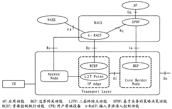 RACS是NGN的組成部分之一,將業(yè)務(wù)層的資源需求與網(wǎng)絡(luò)承載層的資源分配相關(guān)聯(lián),主要完成策略控制、資源預(yù)留、接納控制、網(wǎng)絡(luò)地址轉(zhuǎn)換(NAT)和防火墻穿越等功能。RACS通過一系列策略為應(yīng)用提供基于傳輸?shù)目刂品⻊?wù),只要該應(yīng)用支持RACS接口,RACS就能保證任意應(yīng)用能夠請求到與其服務(wù)相匹配的傳輸資源。同時,RACS為運營商提供多種不同接納控制的方法,并設(shè)置各自的承載服務(wù)策略。RACS為各種服務(wù)提供獲得網(wǎng)絡(luò)資源的方法,使得用戶終端可以獲得所提供服務(wù),其總體功能結(jié)構(gòu)如圖3所示[5]。