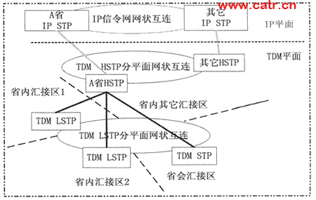 按照混合方式的網(wǎng)絡(luò)組織如下:作為TDM信令網(wǎng)的補充,IP STP和TDM STP共同承擔(dān)省會匯接區(qū)的業(yè)務(wù)。IP