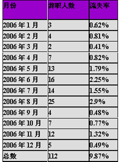 在進行收集、分析一些客服中心資料的過程中,與相關領導人員進行較深入的思想碰撞,尤其是與中國移動江蘇省客服中心副總經理張立春的交流,尤為深刻。一組數據深深的震撼著我的思想,一是離職率2006年,僅為:9.87%,遠遠好于整個行業(yè)的平均水平;二是員工的心理健康和壓力狀況遠遠好于全國的平均水平;三是客戶服務質量保持行業(yè)領先地位,各項指標具體數值陳述如下。
