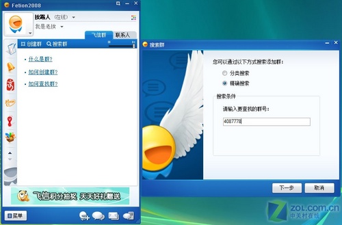 在圖4中,切換到“飛信群”選項(xiàng),單擊“搜索群”按鈕,在彈出的“搜索群”對話框中點(diǎn)選“精確搜索”,最后輸入“群號碼”并單擊“下一步”按鈕(如圖10)。