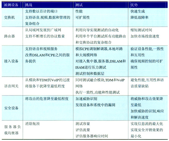 此外,思博倫還可以提供安全風險管理解決方案。服務商和網絡設備制造商可以生成真實的流量,并將其引入網絡中,然后監(jiān)視各種“惡意代碼”對單個設備和總體網絡性能造成的影響,從而對網絡和設備中可能存在的漏洞進行周全的測試。表1為思博倫基礎設施測試的挑戰(zhàn)和優(yōu)勢。