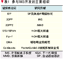 3GPP采用和其他標(biāo)準(zhǔn)化組織密切合作的方式制訂IMS技術(shù)標(biāo)準(zhǔn),并依靠各國通信界的協(xié)同不斷發(fā)展和完善(如表1所示)。其中,最重要的合作就是和IETF聯(lián)合開發(fā)了IMS網(wǎng)絡(luò)的核心控制協(xié)議SIP[1],共同研究SIP的擴(kuò)展和應(yīng)用。另一個重要的合作是和Parlay組織聯(lián)合開發(fā)了支持開放式業(yè)務(wù)提供的Parlay/開放業(yè)務(wù)接入(OSA)應(yīng)用程序接口(API),將源于固定智能網(wǎng)結(jié)構(gòu)開放的Parlay技術(shù)引入IMS網(wǎng)絡(luò)的OSA結(jié)構(gòu)[2]。最重要的協(xié)同就是ETSI的TISPAN研究組和ITU-T提出了IMS中融入固定接入的技術(shù)[3],另一個重要的協(xié)同是OMA組織提出了許多基于IMS實(shí)現(xiàn)的業(yè)務(wù)規(guī)范和技術(shù)[4]。