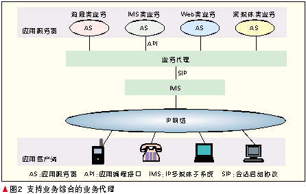 經(jīng)過多年的探索,業(yè)界取得共識網(wǎng)絡(luò)演進(jìn)必須基于業(yè)務(wù)驅(qū)動的策略。必須指出的是,雖然基于SIP技術(shù)的IMS支持的業(yè)務(wù)從語音業(yè)務(wù)擴(kuò)展到了寬帶多媒體業(yè)務(wù),然而其控制機(jī)理本質(zhì)上還是源于傳統(tǒng)電信網(wǎng),因此它最適合于提供的還是諸如VoIP、集群話音、集群視頻等實(shí)時會話型業(yè)務(wù),諸如Web、電子商務(wù)等純數(shù)據(jù)型業(yè)務(wù)并不適合由IMS提供,其他許多有前景的業(yè)務(wù),如流媒體業(yè)務(wù)、IPTV、消息類業(yè)務(wù)等的確IMS已提出或正在積極研究其提供方法,但是已有其他的非IMS提供方式。因此,切不要認(rèn)為IMS是包羅萬象的,更確切地說,IMS是電信界提出的網(wǎng)絡(luò)融合技術(shù),考慮得更多的必然就是和傳統(tǒng)電信業(yè)務(wù)模式類似的業(yè)務(wù)。為了使IMS在未來融合的信息通信網(wǎng)絡(luò)中繼續(xù)保持其重要的地位,在積極研究擴(kuò)大IMS業(yè)務(wù)能力的同時,必須研究新的體系結(jié)構(gòu)既能夠包容IMS型業(yè)務(wù),也能夠包容非IMS型業(yè)務(wù),由此形成融合的開放式的業(yè)務(wù)平面。這就是熱點(diǎn)研究之中的業(yè)務(wù)代理技術(shù),實(shí)際上就是架構(gòu)在IMS之上的綜合業(yè)務(wù)平臺,如圖2所示。它至少能夠提供4大類業(yè)務(wù):IMS類業(yè)務(wù)、消息類業(yè)務(wù)、流媒體業(yè)務(wù)、Web業(yè)務(wù)以及它們的組合,也就是說,除了IMS系統(tǒng)的SIP協(xié)議和API以外,業(yè)務(wù)平臺還應(yīng)能支持其他眾多的非IMS系統(tǒng)協(xié)議和接口,由此構(gòu)成融合的業(yè)務(wù)層。IMS系統(tǒng)是其中的一個重要組成部分,擔(dān)負(fù)起通信網(wǎng)絡(luò)的融合重任。