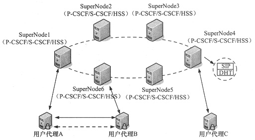 在分布式IMS架構(gòu)中,每一個(gè)SuperNode都包含兩類功能:基于DHT的HSS功能和基于SIP的會(huì)話控制功能;赟IP的會(huì)話控制功能包括P-CSCF功能和S-CSCF功能,P-CSCF為用戶代理接入到系統(tǒng)中的入口點(diǎn),S-CSCF扮演歸屬地會(huì)話控制的角色。P-CSCF和S-CSCF的功能和3GPP