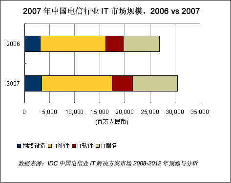 IDC《中國電信行業(yè)IT解決方案市場2008-2012年預測與分析》報告的數據顯示,2007年中國電信行業(yè)整體IT支出規(guī)模為305.02億元人民幣,比2006年增長了13.2%。2007年電信行業(yè)IT運營支撐系統(tǒng)和增值業(yè)務系統(tǒng)的高速增長主要是由于運營商都在為3G的實施和全業(yè)務運營做準備。