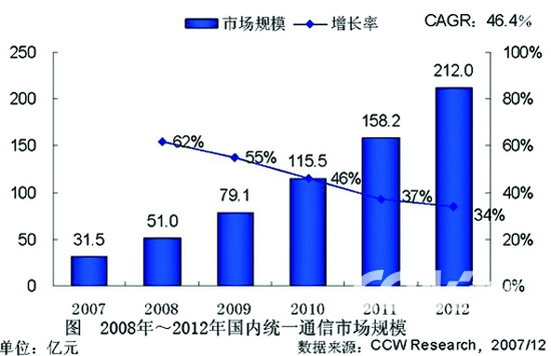國(guó)內(nèi)外市場(chǎng)分析機(jī)構(gòu)先后推出關(guān)于統(tǒng)一通信的調(diào)查報(bào)告和分析預(yù)測(cè): 計(jì)世資訊今年6月發(fā)布的最新報(bào)告顯示,2008年國(guó)內(nèi)統(tǒng)一通信的市場(chǎng)規(guī)模將達(dá)到51億元人民幣,而從2008年到2012年,在未來五年的時(shí)間里,國(guó)內(nèi)統(tǒng)一通信市場(chǎng)將保持較快的增長(zhǎng)趨勢(shì),年復(fù)合增長(zhǎng)率將達(dá)到46.4%,截至2012年,國(guó)內(nèi)統(tǒng)一通信市場(chǎng)的規(guī)模將達(dá)到212億元人民幣。