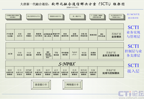 案例:我與大唐中聯(lián)(大唐融合)、和創(chuàng)世紀(jì)、華夏成訊等公司的技術(shù)開發(fā)人員經(jīng)過幾年來的摸索與實(shí)踐開發(fā),提出軟件化融合通信解決方案(SCTI)。通過計(jì)算機(jī)的軟件(通信服務(wù)系統(tǒng))來實(shí)現(xiàn)交換機(jī)上的所有通信功能,在互聯(lián)網(wǎng)上實(shí)現(xiàn)所有傳統(tǒng)通信網(wǎng)上的所有功能、還實(shí)現(xiàn)互聯(lián)網(wǎng)上的新的通信功能,在與傳統(tǒng)通信網(wǎng)上相連,只需增加一塊語音接口卡,就能實(shí)現(xiàn)互聯(lián)網(wǎng)與傳統(tǒng)通信的統(tǒng)一。此方案的成本比統(tǒng)一通信、融合通信等解決方案的成本要降幾十倍到上百倍。
