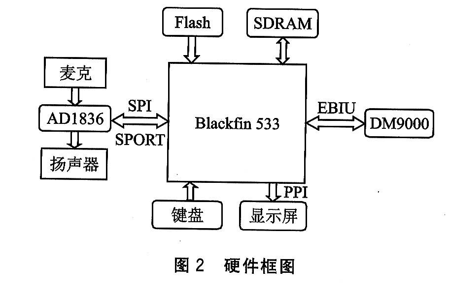 Blackfin 533為核心處理器芯片。外圍輔以ADl836實(shí)現(xiàn)語音信號(hào)的采集和播放;DM9000實(shí)現(xiàn)網(wǎng)絡(luò)數(shù)據(jù)包的收發(fā);TFT