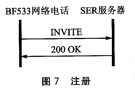 注冊(cè)過程如圖7所示。BF533網(wǎng)絡(luò)電話和SER服務(wù)器共交換了兩條消息:一條是目標(biāo)系統(tǒng)向服務(wù)器發(fā)送的REGISTER請(qǐng)求消息,另一條是服務(wù)器發(fā)送的200