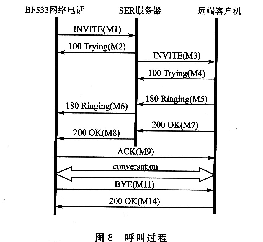呼叫過程如圖8所示。BF533網(wǎng)絡(luò)電話(BP)先是向SER服務(wù)器發(fā)送了一條INⅥTE消息(M1),要求與遠(yuǎn)端客戶機(jī)(RC)進(jìn)行對(duì)話。SER馬上回復(fù)一條100
