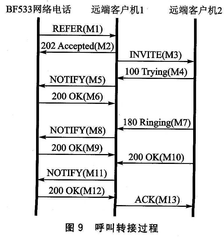 該過程是通過擴(kuò)展的SIP信令REFER來完成的,交互過程如圖9所示。當(dāng)BF533網(wǎng)絡(luò)電話要將它和遠(yuǎn)端客戶機(jī)1(RCl)的通話轉(zhuǎn)接到遠(yuǎn)端客戶機(jī)2(RC2)時(shí),BF發(fā)送REFER(M1)給RCl,該信息中Refer—To字頭標(biāo)明了RC2的URL,之后RCl回復(fù)202