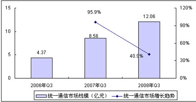 圖 1 2008年Q3中國統(tǒng)一通信整體市場規(guī)模