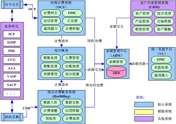 在線計(jì)費(fèi)系統(tǒng)通過實(shí)時(shí)信令交互實(shí)現(xiàn)對高風(fēng)險(xiǎn)和高價(jià)值業(yè)務(wù)的實(shí)時(shí)計(jì)費(fèi);綜合計(jì)費(fèi)帳務(wù)系統(tǒng)通過準(zhǔn)實(shí)時(shí)話單采集實(shí)現(xiàn)對后付費(fèi)用戶的準(zhǔn)實(shí)時(shí)計(jì)費(fèi);綜合帳務(wù)系統(tǒng)實(shí)現(xiàn)全業(yè)務(wù)的綜合優(yōu)惠和帳務(wù)處理;獨(dú)立的余額管理中心實(shí)現(xiàn)對電信余額的統(tǒng)一管理,未來將成為電信的“內(nèi)部銀行”;統(tǒng)一充值平臺(tái)實(shí)現(xiàn)全網(wǎng)全業(yè)務(wù)的統(tǒng)一充值支付。