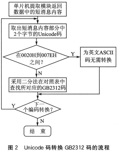 單片機(jī)通過串口與模塊連接后,發(fā)送讀取第一條新短消息指令:“AT+CMGR=1”。提取模塊接收的短消息后,先判斷其內(nèi)容是否為ASCII碼。若為ASCII碼,則無需轉(zhuǎn)換直接讀。环駝t,通過查表法查找其對應(yīng)的漢字GB碼,實現(xiàn)不同編碼間的轉(zhuǎn)換。轉(zhuǎn)換流程如圖2所示。