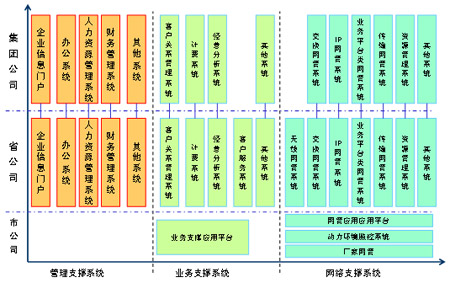 從系統(tǒng)的部署來看,主要集中在集團(tuán)與省公司,其中,集團(tuán)公司系統(tǒng)主要具備面向全公司的企業(yè)管理、經(jīng)營分析等功能;省公司從以職能管理為主逐步轉(zhuǎn)變?yōu)橐陨a(chǎn)管理為主,具有了越來越多的生產(chǎn)職能,在運(yùn)營支撐系統(tǒng)建設(shè)中的作用更加突出;市公司的生產(chǎn)管理職能有所削弱,將主要負(fù)責(zé)市場的具體營銷、客戶支撐以及設(shè)備的現(xiàn)場維護(hù)等工作,F(xiàn)有系統(tǒng)主要存在以下幾個(gè)問題: