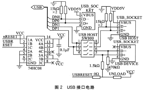 在ARM9開發(fā)板內(nèi)部含有1個(gè)USB2.O接口控制器,接口電路如圖2所示。共有3個(gè)LISB接口(2個(gè)Host和1個(gè)Device),通過選擇開關(guān)SW800進(jìn)行選通控制。74HC08作為4個(gè)二輸入與門邏輯電路,負(fù)責(zé)控制信號的邏輯組合。該接口用來連接USB接口的外部設(shè)備。