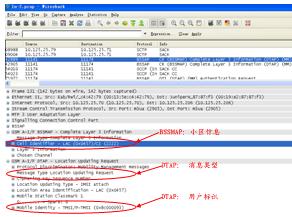 以上是一個用戶開機(jī)的信令過程,在BSSMAP消息層中,可以獲取CGI=0X0457-2222;在DTAP消息層中,可以獲得獲得本次消息類型為LocationUpdatingREQ,同時用戶標(biāo)識為TMSI=0X8c000093,通過對對之前或之后(簽權(quán)、IDREQ/RSP)等信令的關(guān)聯(lián),可以獲得用戶IMSI、MSISDN和CGI的對應(yīng)關(guān)系。其它信令過程,如周期性位置更新、短信收發(fā)、主被叫等,和以上分析過程類似。