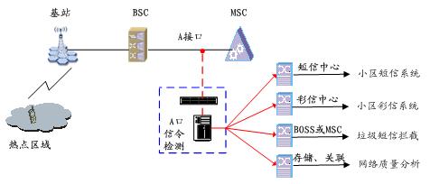 A口信令檢測的應(yīng)用非常廣泛,如網(wǎng)絡(luò)質(zhì)量分析系統(tǒng)、小區(qū)短信、小區(qū)彩信、垃圾短信攔截等。這些正成為通信運(yùn)營商的業(yè)務(wù)增長點(diǎn)。其業(yè)務(wù)應(yīng)用組網(wǎng)圖如下: