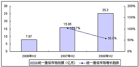 賽迪顧問數據顯示,2008年下半年,中國統(tǒng)一通信市場繼續(xù)延續(xù)了上半年的快速增長,整體市場規(guī)模超過了25.2億,同比增長58%,超過2007年全年市場規(guī)模。