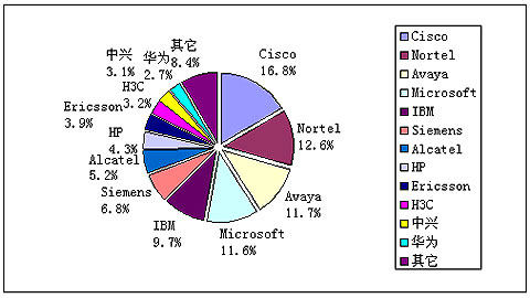 賽迪顧問預測,2009年中國統(tǒng)一通信市場中,在通信設備領域,Cisco市場份額將達到16.8%,繼續(xù)保持領頭樣的位置,而且市場份額有望繼續(xù)增加,Nortel和Avaya緊隨其后,市場份額分別將達到12.6%和11.7%。而在軟件廠商方面,Microsoft和IBM將繼續(xù)保持市場領先地位,市場份額分別將達到11.6%和9.7%,增長勢頭強勁。其它市場份額較大的國外統(tǒng)一通信廠商還有西門子、阿爾卡特、愛立信、HP等。在國內方面,中興和H3C分別以約3%的市場份額占據領先位置。