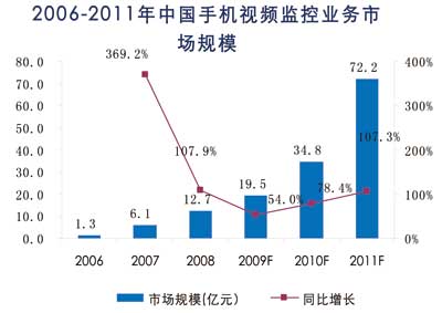 根據(jù)諾達(dá)咨詢《手機(jī)視頻監(jiān)控市場(chǎng)及用戶行為研究報(bào)告2009》研究結(jié)果,2006-2009年為手機(jī)監(jiān)控業(yè)務(wù)導(dǎo)入期,2006年手機(jī)監(jiān)控業(yè)務(wù)市場(chǎng)規(guī)模達(dá)到1.3億人民幣,手機(jī)監(jiān)控業(yè)務(wù)的年運(yùn)營(yíng)費(fèi)用自2009年開始,將會(huì)逐步下降,目前平均約1000元/年,至2011年將逐步下降到600元/年,設(shè)備費(fèi)用也將由目前的3000元/點(diǎn),逐步下降到2011年的1000元/點(diǎn)。