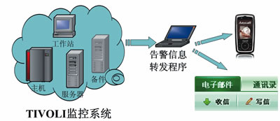 在具體實(shí)施上,為了形成統(tǒng)一的體系以方便監(jiān)控并達(dá)到告警信息與實(shí)時(shí)的反饋,可將以上4個(gè)層面因素納入IBM公司開(kāi)發(fā)的TIVOLI監(jiān)控系統(tǒng)。除此之外,為實(shí)現(xiàn)告警信息的自動(dòng)推送與分發(fā),可將自行開(kāi)發(fā)告警信息轉(zhuǎn)發(fā)程序接入TIVOLI監(jiān)控系統(tǒng)信息庫(kù)。一旦檢測(cè)到異常信息存在則立即進(jìn)行短信或郵件的發(fā)送,確保維護(hù)人員及時(shí)了解接口系統(tǒng)運(yùn)行情況。整個(gè)過(guò)程如圖2所示。