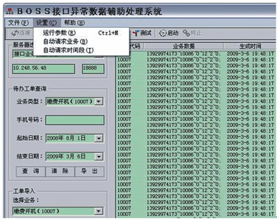 利用BOSS接口異常數(shù)據(jù)輔助處理系統(tǒng)執(zhí)行以上應(yīng)急流程的方式是:在提取號(hào)碼后,根據(jù)客服協(xié)議開(kāi)機(jī)命令字10007格式要求(HandsetNo~工號(hào)~返回格式~nCode~sType~備注),將批量號(hào)碼構(gòu)造成報(bào)文列表并導(dǎo)入系統(tǒng)執(zhí)行。主界面如圖5所示。