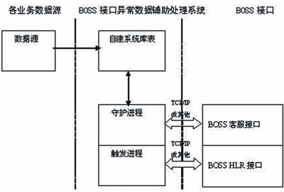值得一提的是,作為BOSS與外圍系統(tǒng)的承接點(diǎn),接口的功能最終可歸結(jié)為對(duì)BOSS與外圍系統(tǒng)數(shù)據(jù)庫(kù)的操作。其中,主動(dòng)接口的實(shí)現(xiàn)邏輯對(duì)BOSS2.0接口監(jiān)控措施的實(shí)現(xiàn)至關(guān)重要。
