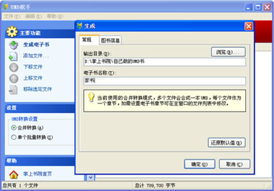 點擊“添加文件”,將你想要轉(zhuǎn)換的電子書添加至軟件窗口,大批量轉(zhuǎn)換的用戶可一次性選中多個文件添加,添加完畢后,你可以隨時通過“上移文件”和“下移文件”按鈕來調(diào)整你文件擺放的位置,或者移除不需要轉(zhuǎn)換的文件。確認后,選擇合并轉(zhuǎn)換或是單個批量轉(zhuǎn)換,合并轉(zhuǎn)換是將添加的文件合并成一本UMD電子書,單個批量轉(zhuǎn)換是每個文件生成一本UMD電子書。設置完后點擊“生成電子書”,在彈出的對話框中設置輸出目錄、電子書名稱、電子書封面、作者、來源后點擊確認,出現(xiàn)正在轉(zhuǎn)換的進度條,完成制作后會自動打開電子書所在的目錄,你的電子書制作完成,是不是非常簡單。