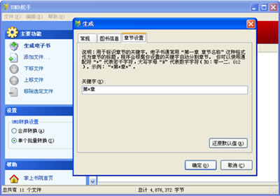 對于單個批量轉(zhuǎn)換的用戶而言,UMD舵手擁有智能斷章功能,完美解決了TXT電子書在手機上無法分章的難題。在“章節(jié)設置”選項卡中輸入用于制作章節(jié)目錄的關(guān)鍵字。例如:1、“第一章華山論劍”,則輸入的關(guān)鍵字可為:“第*章”;“一、華山論劍”,則輸入的關(guān)鍵字可為:“N、”;“【華山論劍】”,則輸入的關(guān)鍵字可為:“【*】”;“1-3-5節(jié):華山論劍”,則輸入關(guān)鍵字可為:“N-N-N