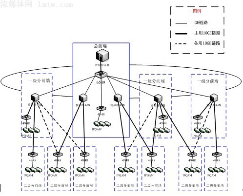 方案二:全集中式。在總前端集中部署若干臺視頻服務器,通過萬兆網(wǎng)絡直接向各分前端提供視頻流服務;示意圖如下: