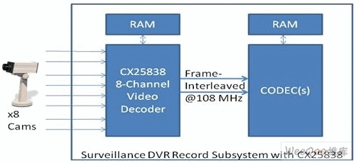 為了應(yīng)對這個(gè)挑戰(zhàn)并降低集成成本,科勝迅系統(tǒng)公司新近推出8通道視頻解碼器CX25838和CX25858,可提供幀交錯(cuò)輸出并與監(jiān)控DVR中普遍使用的編解碼器兼容。圖2顯示了當(dāng)帶有幀交錯(cuò)輸出的CX25838