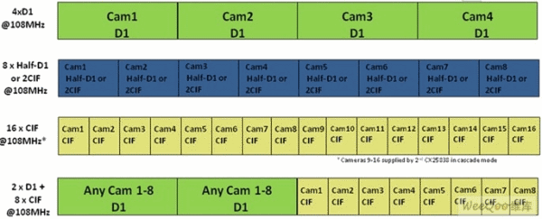 CX25838為監(jiān)控DVR設(shè)計(jì)人員提供機(jī)會(huì),通過提供幀交錯(cuò)數(shù)據(jù)實(shí)現(xiàn)編解碼器效率最大化,而不采用昂貴的FPGA或可編程邏輯。它還通過提供各種分辨率和幀速率,在一系列產(chǎn)品*享系統(tǒng)架構(gòu),提供規(guī)模優(yōu)勢的能力。例如,低成本DVR可采用一個(gè)編解碼器以全幀速率壓縮16個(gè)CIF分辨率通道,這可通過一條8位總線實(shí)現(xiàn)。其他解決方案可能需要每個(gè)編解碼器以全幀速率壓縮4個(gè)D1分辨率通道。還有些可能需要降低幀速率的D1